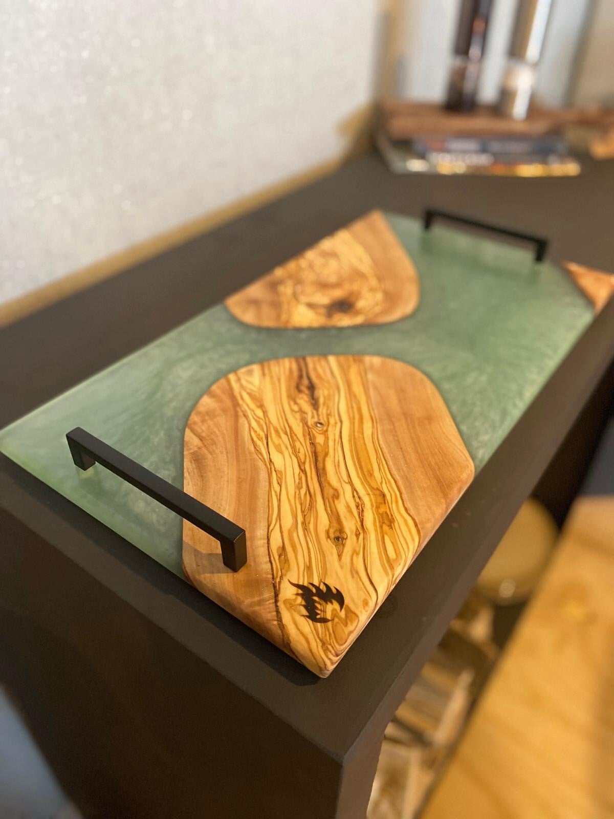 Serveertray mint metallic epoxy en olijfhout. 51x28 cm